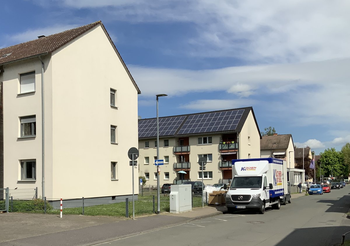 Die Stadt ist mit über 300 Wohneinheiten einer der größten Vermieter in Andernach. Viele dieser Wohnungen finden sich in der von-Bodelschwingh-Straße. Auf der Westseite der Straße stehen insgesamt neun dreigeschossige Mehrfamilienhäuser, davon sind fünf im Eigentum der Stadt. Alle neun Häuser haben die gleiche Ausrichtung und ein flach geneigtes Satteldach. Eine PV-Anlage finden wir aber nur bei einem einzigen Wohnhaus, nämlich auf Haus Nr. 8. Dort kam die PV-Anlage nach der Generalsanierung 2011 aufs Dach, der erzeugte Strom wird ins Netz eingespeist. Die Grünen hatten wiederholt angeregt, auch in anderen städtischen Wohnhäusern PV und Batteriespeicher zu installieren.